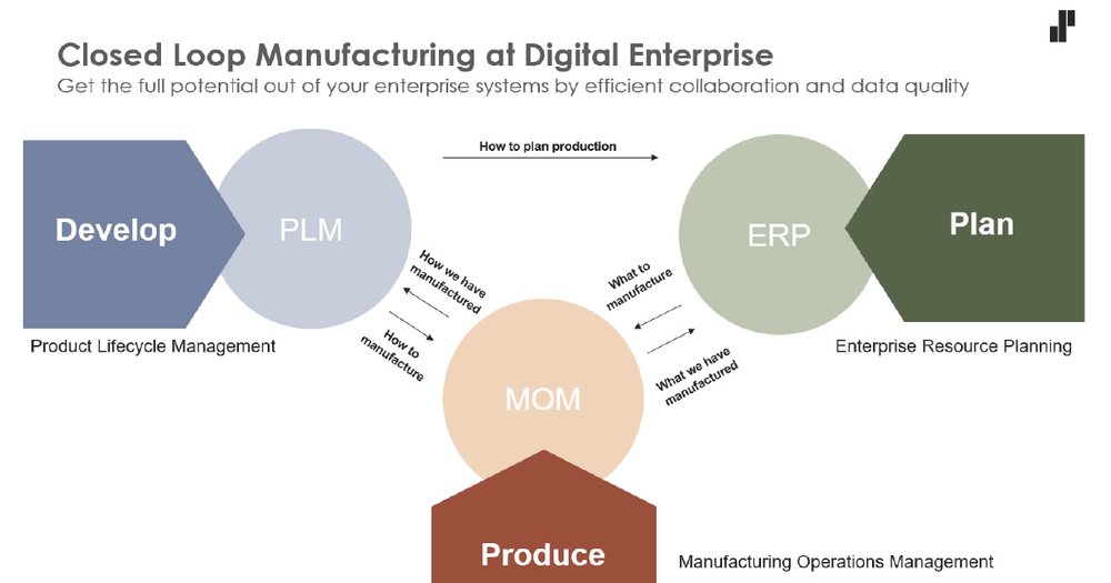 Systemy ERP decydują, co należy wyprodukować, PLM definiuje, jak to wyprodukować, a MOM (Manufacturing Operations Management, poziom 3) zapewnia, że produkty są faktycznie wytwarzane zgodnie z planem. Ważne jest, że przepływ informacji działa w obie strony: MOM dostarcza ERP i PLM dane o tym, co zostało wyprodukowane, podczas gdy ERP i PLM przekazują MOM informacje planistyczne i projektowe. Tworzy się w ten sposób pętla sprzężenia zwrotnego, w której nasza fikcyjna firma ACME może dostosowywać plany i definicje produktów na podstawie rzeczywistej wydajności produkcji. Bez tej pętli późne zmiany inżynieryjne mogą prowadzić do opóźnień produkcji, niespójnych definicji produktów między zakładami lub niepotrzebnych kosztów materiałów i narzędzi.